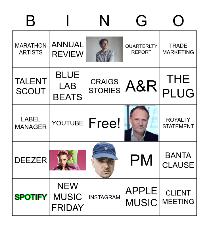 This bingo card has 6 images, a free space and 23 words: SPOTIFY, TIDAL, YOUTUBE, NOVO AMOR, MARATHON ARTISTS, BLUE LAB BEATS, NEW MUSIC FRIDAY, ROYALTY STATEMENT, CLIENT MEETING, INSTAGRAM, APPLE MUSIC, THE PLUG, DEEZER, TRADE MARKETING, LABEL MANAGER, PM, DIGITAL MARKETER, A&R, TALENT SCOUT, QUARTERLTY REPORT, ANNUAL REVIEW, BANTA CLAUSE and CRAIGS STORIES.