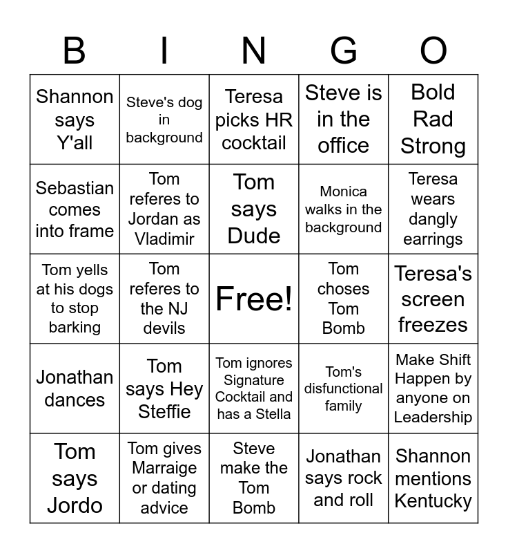 This bingo card has a free space and 24 words: Tom says Hey Steffie, Tom gives Marraige or dating advice, Tom says Dude, Tom says Jordo, Bold Rad Strong, Shannon says Y'all, Sebastian comes into frame, Steve's dog in background, Tom choses Tom Bomb, Tom ignores Signature Cocktail and has a Stella, Monica walks in the background, Tom yells at his dogs to stop barking, Tom's disfunctional family, Make Shift Happen by anyone on Leadership, Tom referes to Jordan as Vladimir, Jonathan says rock and roll, Teresa's screen freezes, Teresa picks HR cocktail, Teresa wears dangly earrings, Tom referes to the NJ devils, Shannon mentions Kentucky, Jonathan dances, Steve is in the office and Steve make the Tom Bomb.