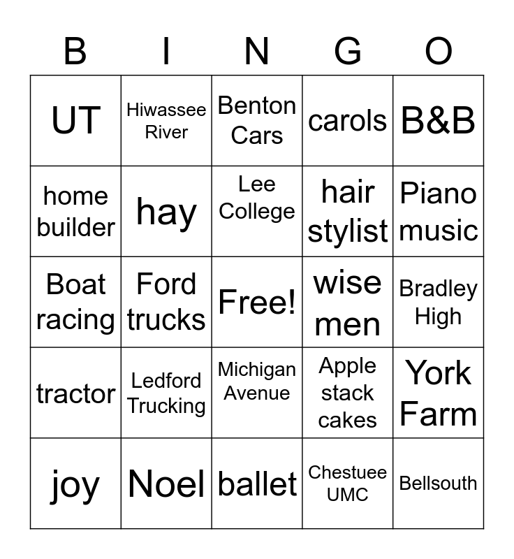 This bingo card has a free space and 42 words: Lee University, Lee College, North Cleveland Church of God, Ledford Trucking, Chestuee UMC, York Farm, Bellsouth, Hardwick's, Benton Cars, Michigan Avenue, Bradley High, Piano music, Ford trucks, B&B, Attorney, Apple stack cakes, Roadway, Boat racing, scrap metal, Hiwassee River, home builder, building inspector, Chilcutt UMC, UT, UTC, cattle, hair stylist, usher, church choir, Ham Radio, local politics, tractor, hay, ballet, Christmas, joy, Noel, wise men, Baby Jesus, gifts, carols and lights.