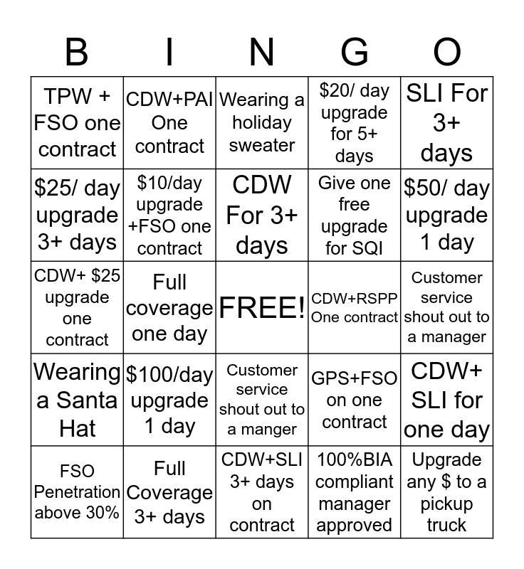 This bingo card has a free space and 24 words: $100/day upgrade 1 day, Full Coverage 3+ days, CDW For 3+ days, FSO Penetration above 30%, SLI For 3+ days, TPW + FSO one contract, $25/ day upgrade 3+ days, CDW+PAI One contract, CDW+RSPP One contract, Customer service shout out to a manger, Give one free upgrade for SQI, CDW+ $25 upgrade one contract, GPS+FSO on one contract, CDW+ SLI for one day, $10/day upgrade +FSO one contract, 100%BIA compliant manager approved, Customer service shout out to a manager, Wearing a holiday sweater, $50/ day upgrade 1 day, Full coverage one day, Upgrade any $ to a pickup truck, Wearing a Santa Hat, $20/ day upgrade for 5+ days and CDW+SLI 3+ days on contract.