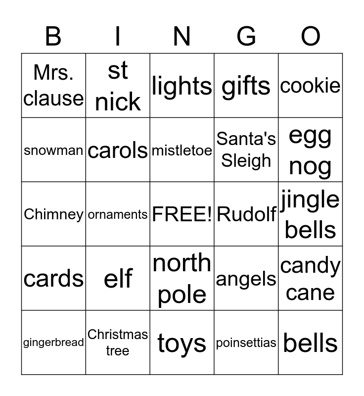 This bingo card has a free space and 24 words: elf, Christmas tree, mistletoe, gingerbread, cookie, Mrs. clause, snowman, st nick, Rudolf, north pole, Santa's Sleigh, Chimney, angels, candy cane, carols, poinsettias, jingle bells, lights, egg nog, ornaments, bells, cards, gifts and toys.