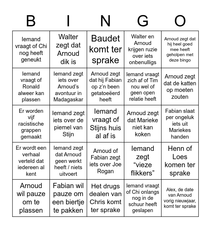 This bingo card has a free space and 30 words: Fabian wil pauze om een biertje te pakken, Walter zegt dat iemand z’n bek moet houden, Iemand zegt iets over de piemel van Stijn, Arnoud zegt iets over corona, Iemand vraagt of Chi nog heeft geneukt, Baudet komt ter sprake, Iemand zegt iets over Arnoud’s avontuur in Madagaskar, Arnoud of Fabian zegt iets over Joe Rogan, Arnoud zegt dat Marieke niet kan koken, Het drugs dealen van Chris komt ter sprake, Fabian slaat per ongeluk iets uit Mariekes handen, Alex, de date van Arnoud vorig nieuwjaar, komt ter sprake, Iemand vraagt of Chi onlangs nog in de schuur heeft geslapen, Er wordt in twijfel getrokken of Michel de volgende carnaval wel haalt, Arnoud zegt dat de katten op moeten zouten, Iemand zegt iets over Duitsers, joden of Hitler, Iemand zegt “vieze flikkers”, Er wordt een verhaal verteld dat iedereen al kent, Iemand zegt dat Arnoud geen werkt heeft / niets uitvoert, Arnoud zegt dat hij heel goed mee heeft geholpen met deze bingo, Er worden vijf racistische grappen gemaakt, Walter’s diabetes dan wel allergieën komt ter sprake, Walter zegt dat Arnoud dik is, Iemand vraagt zich af of Tim nou wel of geen open relatie heeft, Iemand vraagt of Ronald alweer kan plassen, Walter en Arnoud krijgen ruzie over iets onbenulligs, Henn of Loes komen ter sprake, Arnoud wil pauze om te plassen, Arnoud zegt dat hij Fabian op z’n been getatoeëerd heeft and Er wordt iemand beledigd.
