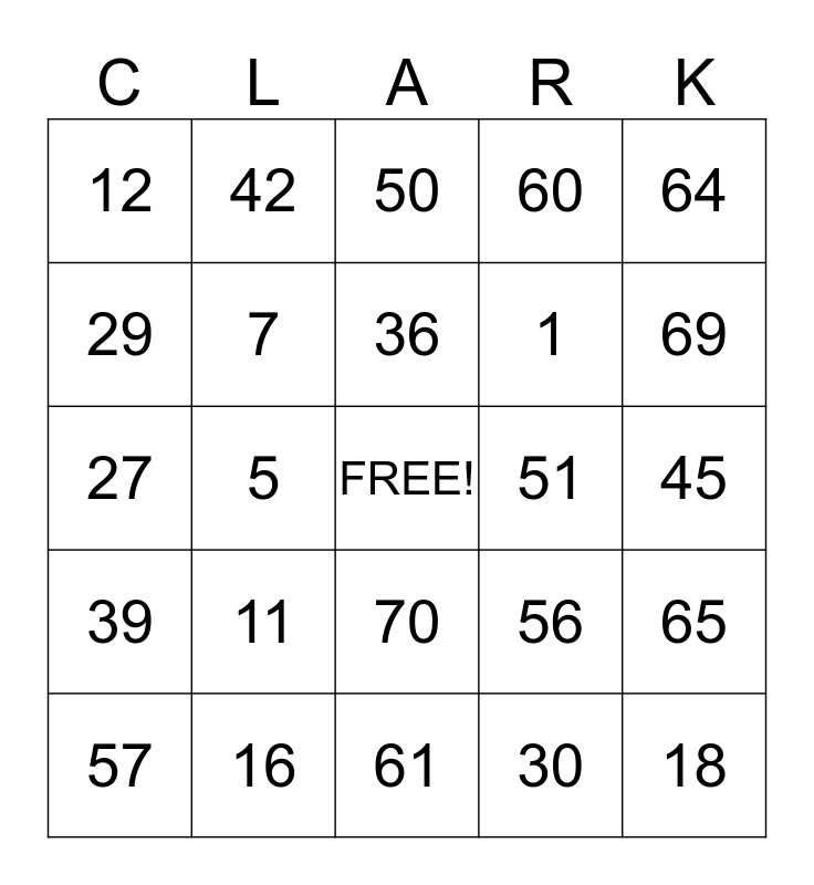This bingo card has a free space and 24 words: 11, 16, 36, 57, 64, 12, 29, 42, 51, 70, 1, 27, 56, 65, 7, 30, 45, 50, 69, 5, 18, 39, 60 and 61.