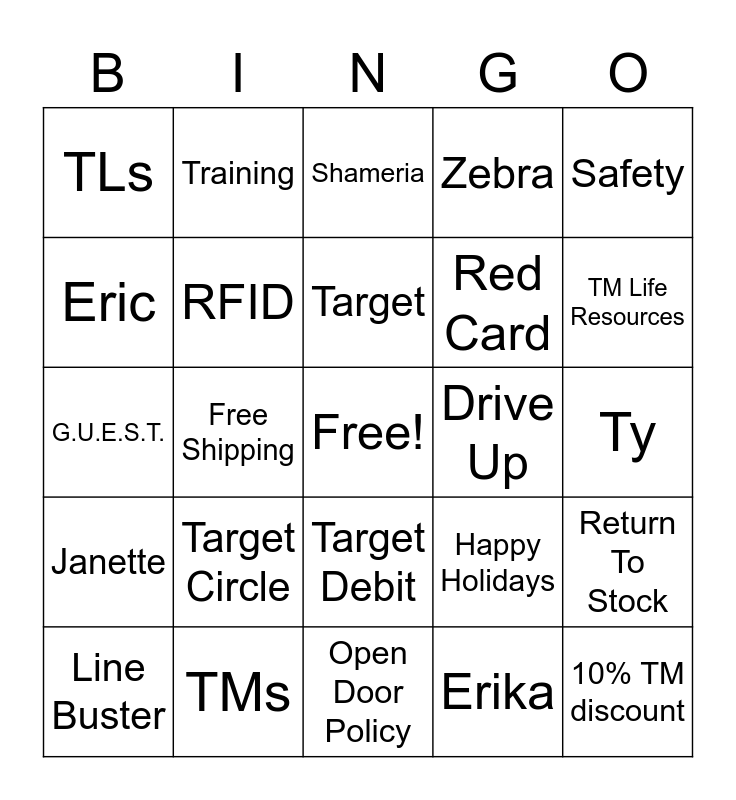 This bingo card has a free space and 29 words: Line Buster, Efrain, Free Shipping, Fulfillment, TLs, Shameria, RFID, Target Circle, Drive Up, TMs, Ty, 10% TM discount, Open Door Policy, Erika, TM Life Resources, OPU, Target Debit, Janette, Safety, G.U.E.S.T., Happy Holidays, Bullseye, Red Card, Eric, Zebra, Training, Return To Stock, Target and Price Accuracy Challenge.