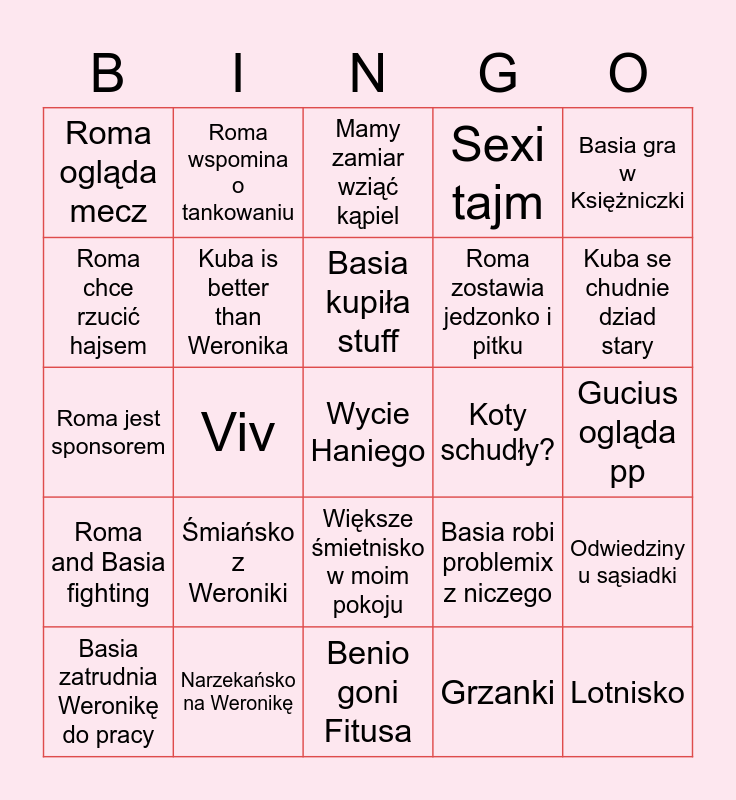 This bingo card has a free space and 24 words: Śmiańsko z Weroniki, Narzekańsko na Weronikę, Basia kupiła stuff, Basia zatrudnia Weronikę do pracy, Basia gra w Księżniczki, Roma ogląda mecz, Roma chce rzucić hajsem, Roma wspomina o tankowaniu, Koty schudły?, Większe śmietnisko w moim pokoju, Roma zostawia jedzonko i pitku, Roma jest sponsorem, Basia robi problemix z niczego, Odwiedziny u sąsiadki, Kuba is better than Weronika, Grzanki, Gucius ogląda pp, Mamy zamiar wziąć kąpiel, Kuba se chudnie dziad stary, Viv, Lotnisko, Roma and Basia fighting, Sexi tajm and Benio goni Fitusa.