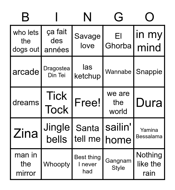 This bingo card has a free space and 24 words: Jingle bells, Whoopty, las ketchup, man in the mirror, in my mind, who lets the dogs out, arcade, ça fait des années, we are the world, Santa tell me, Wannabe, dreams, sailin' home, Yamina Bessalama, Dragostea Din Tei, Gangnam Style, Dura, Savage love, Snappie, Tick Tock, Nothing like the rain, Zina, El Ghorba and Best thing I never had.
