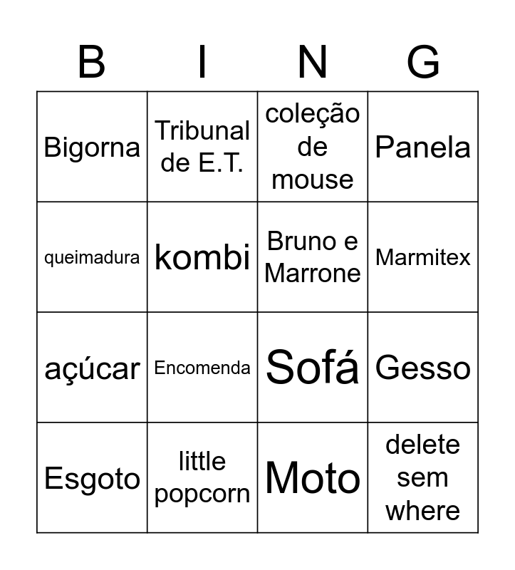 This bingo card has 27 words: combo de drink, curupira, açúcar, divo, kombi, coleção de mouse, Tribunal de E.T., delete sem where, little popcorn, bp impostora, Sofá, Panela, Trovão, Dormir, Encomenda, Reino animal, Bruno e Marrone, Marmitex, Motoca, Bigorna, Moto, exorcista, Gesso, Esgoto, Guerra infinita, queimadura and mundo com lábios.