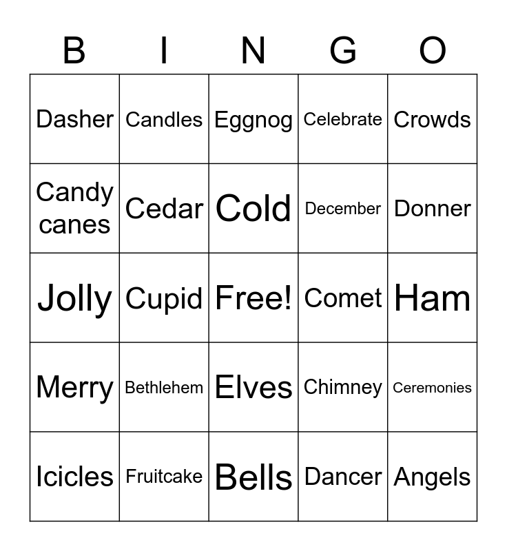 This bingo card has a free space and 50 words: Advent, Angels, Announcement, Bells, Bethlehem, Blitzen, Candles, Candy, Candy canes, Cards, Cedar, Celebrate, Ceremonies, Chimney, Christmas cookies, Christmas tree, Cold, Comet, Cranberry sauce, Crowds, Cupid, Dancer, Dasher, December, Decorations, Dolls, Donner, Dressing, Eggnog, Elves, Family reunion, Festival, Fir, Frosty, Fruitcake, Gift boxes, Gifts, Goodwill, Greetings, Ham, Happy, Holiday, Holly, Holy, Icicles, Jolly, Lights, Lists, Merry and Miracle.