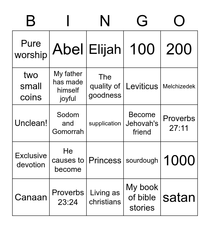 This bingo card has 25 words: He causes to become, Living as christians, The quality of goodness, Canaan, 200, Pure worship, two small coins, Abel, Become Jehovah's friend, Princess, Leviticus, Unclean!, sourdough, 1000, My father has made himself joyful, satan, Proverbs 27:11, Elijah, Melchizedek, Sodom and Gomorrah, supplication, Proverbs 23:24, Exclusive devotion, 100 and My book of bible stories.