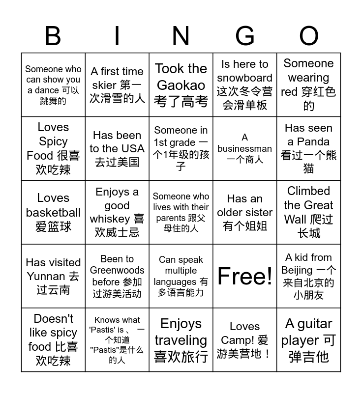 This bingo card has 25 words: Been to Greenwoods before 参加过游美活动, Enjoys traveling 喜欢旅行, Someone in 1st grade 一个1年级的孩子, Doesn't like spicy food 比喜欢吃辣, Someone wearing red 穿红色的, Someone who can show you a dance 可以跳舞的, Loves Spicy Food 很喜欢吃辣, A first time skier 第一次滑雪的人, Has an older sister 有个姐姐, Can speak multiple languages 有多语言能力, A businessman 一个商人, Loves basketball 爱篮球, Free!, A kid from Beijing 一个来自北京的小朋友, Has been to the USA 去过美国, A guitar player 可弹吉他, Climbed the Great Wall 爬过长城, Took the Gaokao 考了高考, Has seen a Panda 看过一个熊猫, Enjoys a good whiskey 喜欢威士忌, Someone who lives with their parents 跟父母住的人, Knows what 'Pastis' is 、 一个知道 "Pastis"是什么的人, Has visited Yunnan 去过云南, Is here to snowboard 这次冬令营会滑单板 and Loves Camp! 爱游美营地!.