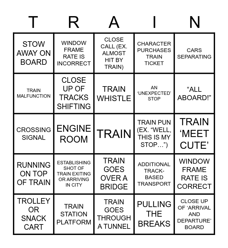 This bingo card has a free space and 32 words: PULLING THE BREAKS, CHARACTER JUMPS OFF MOVING TRAIN, ENGINE ROOM, CHARACTER RUNS TO CATCH MOVING TRAIN, RUNNING ON TOP OF TRAIN, CLOSE UP OF TRACKS SHIFTING, CARS SEPARATING, WINDOW FRAME RATE IS CORRECT, WINDOW FRAME RATE IS INCORRECT, CLOSE UP OF SMOKE EXITING TRAIN CHIMNEY, TRAIN WHISTLE, CLOSE CALL (EX. ALMOST HIT BY TRAIN), SPECIALTY COMPARTMENT CAR (EX. DINING), TRAVEL BY MAP, TRAIN PUN (EX. “WELL, THIS IS MY STOP…”), CONDUCTOR / TICKET TAKER, TROLLEY OR SNACK CART, CROSSING SIGNAL, TRAIN GOES OVER A BRIDGE, ESTABLISHING SHOT OF TRAIN EXITING OR ARRIVING IN CITY, ADDITIONAL TRACK-BASED TRANSPORT, MOTION OF TRAINS CAUSE JOSTLE, TRAIN ‘MEET CUTE’, TRAIN STATION PLATFORM, CLOSE UP OF ‘ARRIVAL AND DEPARTURE’ BOARD, CHARACTER PURCHASES TRAIN TICKET, AN ‘UNEXPECTED’ STOP, TRAIN MALFUNCTION, STOW AWAY ON BOARD, TRAIN GOES THROUGH A TUNNEL, CHARACTER WALKS ALONG TRACKS and “ALL ABOARD!”.