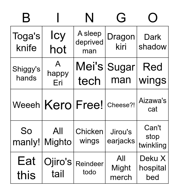 This bingo card has a free space and 24 words: All Mighto, Ojiro's tail, Mei's tech, Eat this, Dark shadow, Toga's knife, Shiggy's hands, Icy hot, Cheese?!, Chicken wings, Sugar man, Weeeh, Jirou's earjacks, Can't stop twinkling, A happy Eri, All Might merch, Aizawa's cat, A sleep deprived man, Red wings, Kero, Deku X hospital bed, So manly!, Dragon kiri and Reindeer todo.