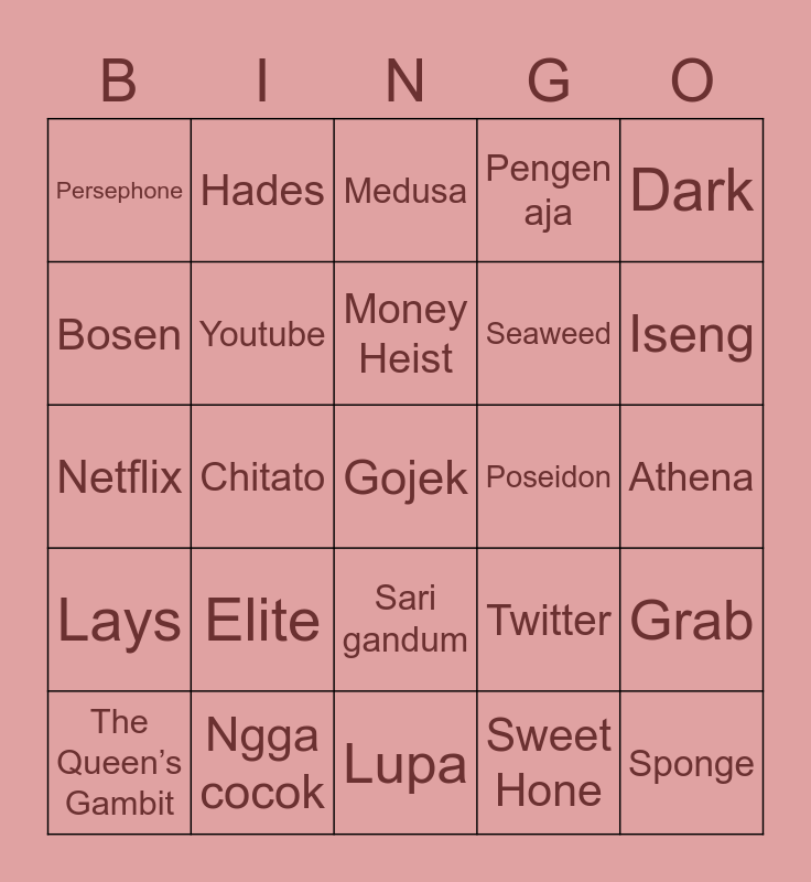This bingo card has a free space and 24 words: The Queen’s Gambit, Elite, Money Heist, Sweet Hone, Dark, Persephone, Hades, Medusa, Poseidon, Athena, Netflix, Youtube, Twitter, Grab, Bosen, Ngga cocok, Lupa, Pengen aja, Iseng, Lays, Chitato, Sari gandum, Seaweed and Sponge.