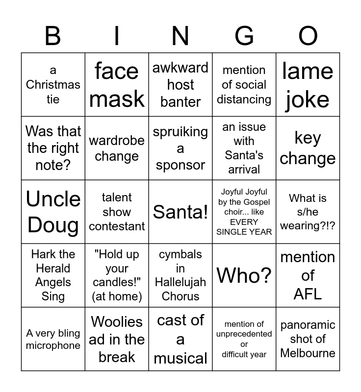 This bingo card has a free space and 29 words: A very bling microphone, Glooo OOOoo ooOOO -ria, talent show contestant, tinsel in the choir or orchestra pit, a Christmas tie, awkward host banter, wardrobe change, "Hold up your candles!" (at home), Joyful Joyful by the Gospel choir... like EVERY SINGLE YEAR, Woolies ad in the break, What is s/he wearing?!?, panoramic shot of Melbourne, cast of a musical, mention of unprecedented or difficult year, key change, Marina Prior, cymbals in Hallelujah Chorus, Hark the Herald Angels Sing, lame joke, Uncle Doug, Who?, This isn't a Christmas song!, an issue with Santa's arrival, Was that the right note?, mention of social distancing, face mask, mention of AFL, spruiking a sponsor and a big ball gown.