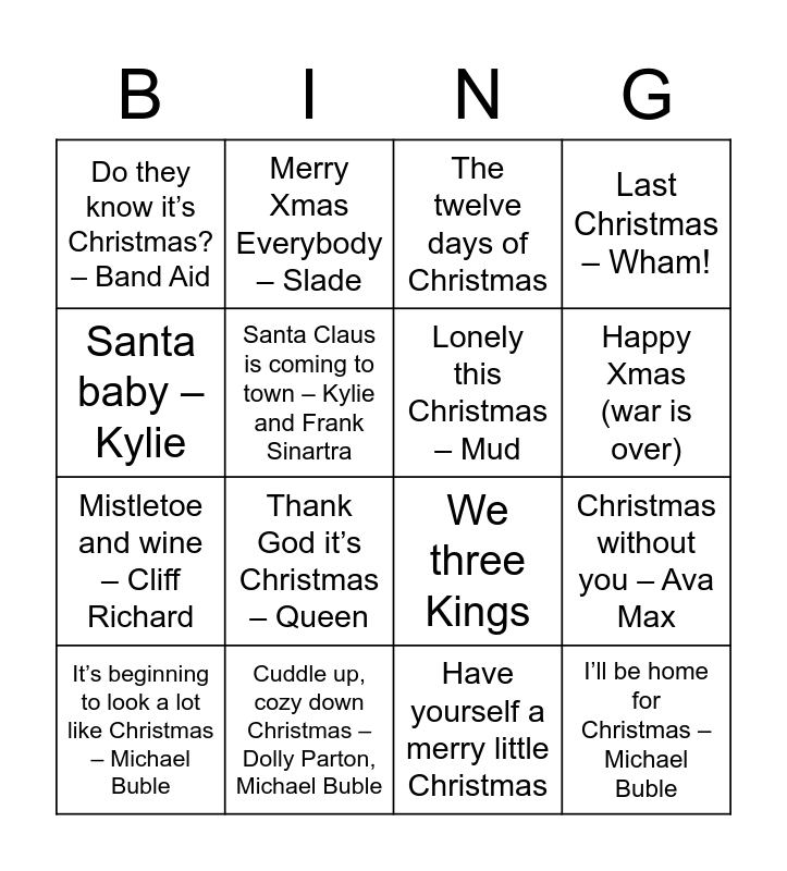 This bingo card has 47 words: Free!, It’s beginning to look a lot like Christmas – Michael Buble, Merry Christmas Everyone – shakin’ Stevens, Fairytale of New York – The Pogues, I wish it could be Christmas everyday – Wizzard, Driving Home for Christmas – Chris Rea, Merry Xmas Everybody – Slade, Rockin’ around the Christmas tree – Brenda Lee, Santa Claus is coming to town – Kylie and Frank Sinartra, All I want for Christmas is you – Mariah Carey, Lonely this Christmas – Mud, Last Christmas – Wham!, Jingle Bell Rock – Bobbly Helms, Wonderful Christmastime – Paul McCartney, Stop the Cavalry – Jona Lewie, It’s the most wonderful time of the year – Andy Williams, Happy Xmas (war is over), Cuddle up, cozy down Christmas – Dolly Parton, Michael Buble, Santa tell me – Ariana Grande, Santa baby – Kylie, Christmas without you – Ava Max, White Christmas – The Drifters, Do they know it’s Christmas? – Band Aid, Mistletoe and wine – Cliff Richard, What Christmas means to me – CeeLo Green, Thank God it’s Christmas – Queen, Let it snow, let it snow, let it snow – Dean Martin, Frosty the snowman – Elton John, The Christmas Song – Nat King Cole, I’ll be home for Christmas – Michael Buble, Mary’s boy child – Matt Monro, Rudolph the red nose reindeer, Little Drummer boy, Here comes santa claus, Deck the hall, Santa Claus is coming to town – The Jackson 5, Have yourself a merry little Christmas, Away in a manger, Little Donkey, The holly and the ivy, I saw Mommy kissing Santa Claus, The twelve days of Christmas, We three Kings, Harks the herald angels sing, Good King Wenceslas, While Shepherds watched and We wish you a merry Christmas.