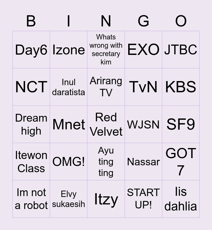 This bingo card has 25 words: OMG!, Itzy, Arirang TV, Im not a robot, JTBC, Day6, NCT, Izone, WJSN, Ayu ting ting, TvN, Dream high, Nassar, GOT 7, Inul daratista, Iis dahlia, SF9, Whats wrong with secretary kim, KBS, Mnet, Red Velvet, Elvy sukaesih, Itewon Class, EXO and START UP!.
