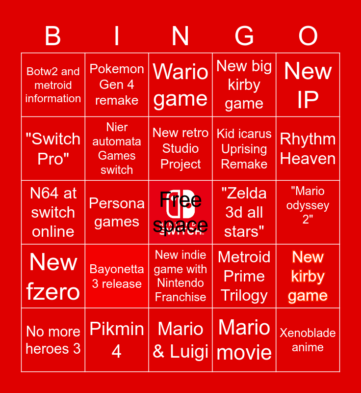 This bingo card has a free space and 24 words: Bayonetta 3 release, Pikmin 4, New retro Studio Project, No more heroes 3, New IP, Botw2 and metroid information, "Switch Pro", Pokemon Gen 4 remake, "Zelda 3d all stars", New indie game with Nintendo Franchise, Kid icarus Uprising Remake, N64 at switch online, Metroid Prime Trilogy, New kirby game, Nier automata Games switch, Mario movie, "Mario odyssey 2", Wario game, Rhythm Heaven, Persona games, Xenoblade anime, New fzero, New big kirby game and Mario & Luigi.