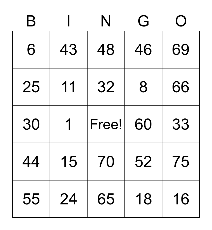 This bingo card has a free space and 24 words: 15, 24, 32, 55, 69, 6, 25, 43, 60, 70, 8, 30, 52, 75, 11, 18, 33, 48, 66, 1, 16, 44, 46 and 65.