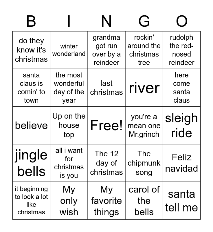 This bingo card has a free space and 24 words: all i want for christmas is you, My only wish, last christmas, it beginning to look a lot like christmas, rudolph the red-nosed reindeer, do they know it's christmas, santa claus is comin' to town, winter wonderland, you're a mean one Mr.grinch, The 12 day of christmas, river, believe, The chipmunk song, Feliz navidad, the most wonderful day of the year, carol of the bells, sleigh ride, grandma got run over by a reindeer, here come santa claus, Up on the house top, santa tell me, jingle bells, rockin' around the christmas tree and My favorite things.