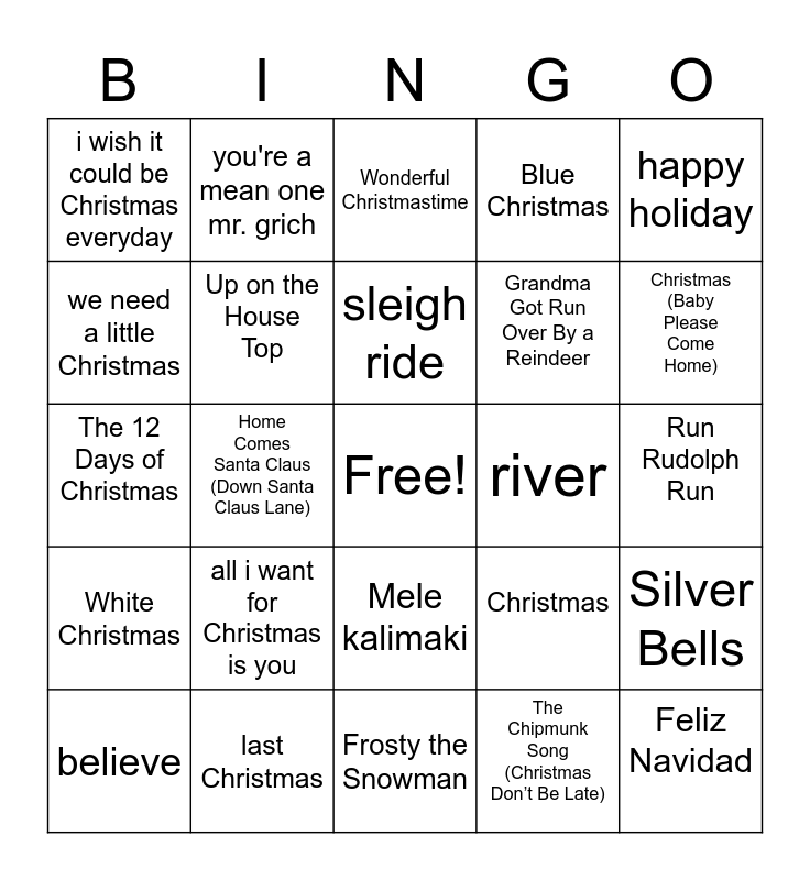 This bingo card has a free space and 24 words: all i want for Christmas is you, last Christmas, sleigh ride, believe, happy holiday, i wish it could be Christmas everyday, we need a little Christmas, you're a mean one mr. grich, river, Mele kalimaki, Grandma Got Run Over By a Reindeer, The 12 Days of Christmas, Christmas, Silver Bells, Up on the House Top, The Chipmunk Song (Christmas Don’t Be Late), Run Rudolph Run, Wonderful Christmastime, Christmas (Baby Please Come Home), Home Comes Santa Claus (Down Santa Claus Lane), Feliz Navidad, White Christmas, Blue Christmas and Frosty the Snowman.