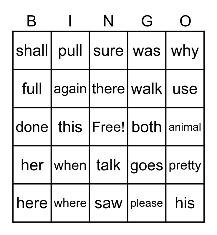 This bingo card has a free space and 24 words: when, where, there, here, why, shall, full, pull, both, talk, walk, done, goes, pretty, again, please, animal, sure, use, this, his, her, was and saw.