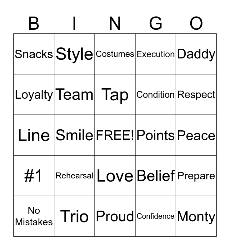 This bingo card has a free space and 37 words: Fun, Hard Work, Weekends, Team, Prepare, Rehearsal, Tap, New, Daddy, Water, Smile, Execution, Monty, Peace, Loyalty, #1, Family, Costumes, Love, Points, Snacks, Respect, No Mistakes, Proud, Intelligence, Confidence, Style, Funky, Jazz, Solo, Duet, Trio, Line, Entertaining, Belief, Condition and Snacks.