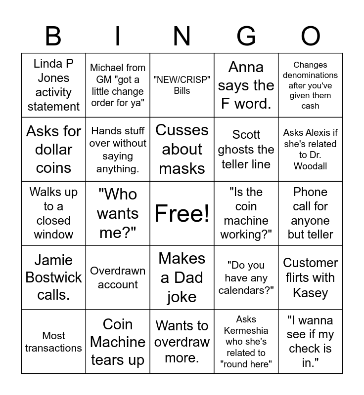 This bingo card has a free space and 24 words: Overdrawn account, Coin Machine tears up, Cusses about masks, Most transactions, Changes denominations after you've given them cash, Linda P Jones activity statement, Asks for dollar coins, Michael from GM "got a little change order for ya", "Is the coin machine working?", Makes a Dad joke, Scott ghosts the teller line, Walks up to a closed window, "Do you have any calendars?", Customer flirts with Kasey, Hands stuff over without saying anything., Asks Kermeshia who she's related to "round here", Phone call for anyone but teller, "NEW/CRISP" Bills, Asks Alexis if she's related to Dr. Woodall, "Who wants me?", "I wanna see if my check is in.", Jamie Bostwick calls., Anna says the F word. and Wants to overdraw more..