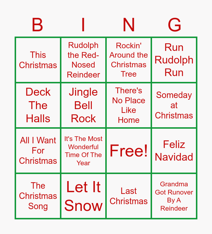 This bingo card has 22 words: Let It Snow, Frosty The Snowman, Rudolph the Red-Nosed Reindeer, Winter Wonderland, Jingle Bell Rock, There's No Place Like Home, This Christmas, Rockin' Around the Christmas Tree, Free!, Grandma Got Runover By A Reindeer, All I Want For Christmas, Run Rudolph Run, Have Yourself a Merry Little Christmas, You're a Mean One Mr. Grinch, Last Christmas, Santa Claus is Coming to Town, Feliz Navidad, The Christmas Song, It's The Most Wonderful Time Of The Year, Deck The Halls, Someday at Christmas and Sleigh Ride.
