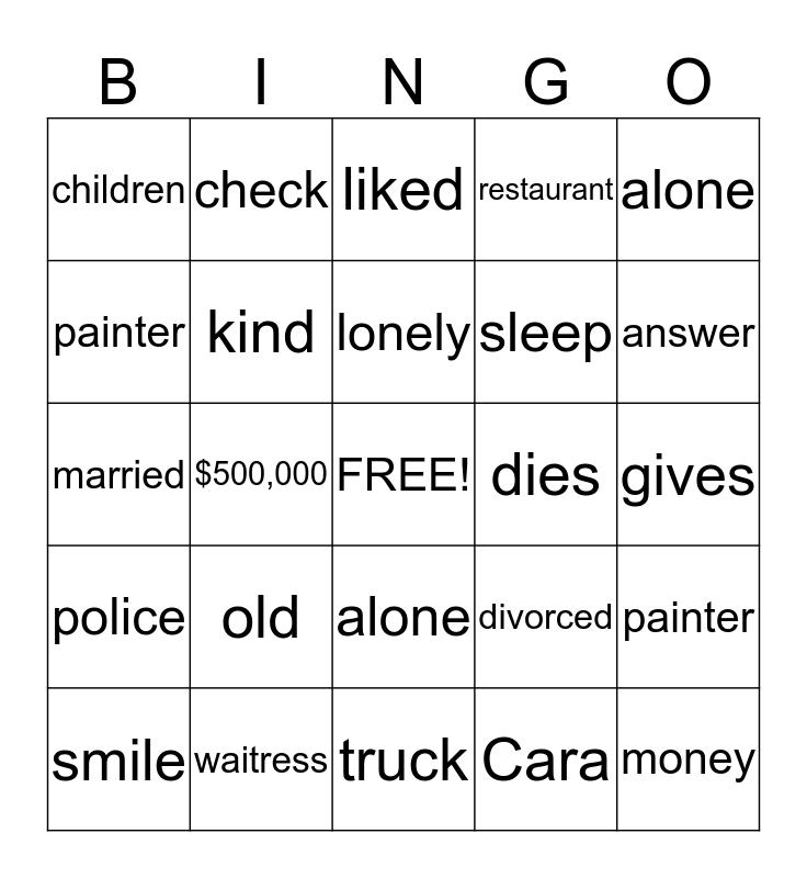 This bingo card has a free space and 24 words: old, waitress, lonely, smile, alone, children, painter, check, dies, alone, sleep, married, divorced, painter, kind, Cara, gives, liked, answer, $500,000, money, police, restaurant and truck.