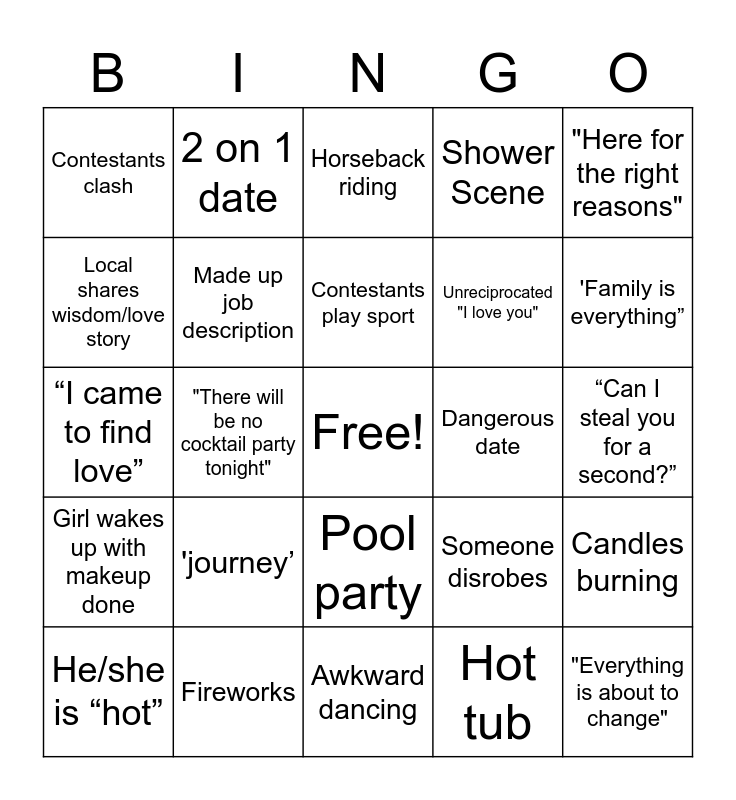 This bingo card has 1 images, a free space and 68 words: “Can I steal you for a second?”, Emotional story shared, Untouched food, Fireworks, Sparkly dress, Shower Scene, Contestants perform, "Here for the right reasons", Gift from contestant, Candles burning, "Strong feelings", Contestants clash, Horseback riding, Surprise Band, "There will be no cocktail party tonight", Pool party, Unreciprocated "I love you", "Looking for my person", Girl wakes up with makeup done, Dangerous date, Someone disrobes, 'Family is everything”, “Emotional intelligence”, Someone is crying, Longing/thoughtful stare, "The most dramatic season yet", Someone in costume, Hot tub, Wildlife shot, 2 on 1 date, Previous marriage, Never been in love, "Secret" that all of America now knows, Pageant girl, Heart to heart with Chris, Ambulance / hospital, Product placement, Local shares wisdom/love story, "Can I walk you out", 'journey’, "Everything is about to change", Contestants tell on each other, “Here for the wrong reasons”, Obvious hair extensions, He/she is “hot”, 1st shared kiss, Tears in the limo, "We need to talk", Made up job description, Contestants play sport, Wine/campaign, Date involving child, Awkward dancing, Exercise montage, “Will you accept this rose”, Cocktails, 'Not here for the right reasons”, Voice over montage, “I came to find love”, Spa / message date, Someone mentions an ex, Someone jumps into bachelor’s arms, Mention of someones ‘awesome family’, 'This is nice”, Piggy back ride, Mascara running, Ferris wheel and Contestant "blindsided".