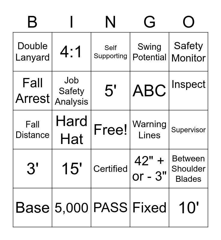 This bingo card has a free space and 27 words: 42" + or - 3", 6', ABC, PASS, Fall Arrest, Self Supporting, 4:1, 3', Warning Lines, Between Shoulder Blades, Fall Distance, Swing Potential, Base, 5,000, Inspect, Falls, Job Safety Analysis, 5', 15', Double Lanyard, Supervisor, Fixed, Hard Hat, 10', Certified, Safety Monitor and Personal Protective Equipment.