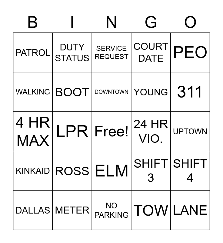 This bingo card has a free space and 24 words: ROSS, METER, DOWNTOWN, DALLAS, PEO, PATROL, WALKING, DUTY STATUS, 24 HR VIO., ELM, YOUNG, 4 HR MAX, SHIFT 3, SHIFT 4, BOOT, TOW, UPTOWN, SERVICE REQUEST, 311, LPR, LANE, KINKAID, COURT DATE and NO PARKING.