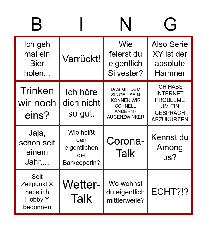 This bingo card has 16 words: Wetter-Talk, Kennst du Among us?, Wie feierst du eigentlich Silvester?, Ich geh mal ein Bier holen..., Jaja, schon seit einem Jahr...., Verrückt!, Corona-Talk, Wo wohnst du eigentlich mittlerweile?, Trinken wir noch eins?, Ich höre dich nicht so gut., Seit Zeitpunkt X habe ich Hobby Y begonnen, Also Serie XY ist der absolute Hammer, Wie heißt den eigentlichen die Barkeeperin?, ICH HABE INTERNET PROBLEME UM EIN GESPRÄCH ABZUKÜRZEN, DAS MIT DEM SINGEL-SEIN KÖNNEN WIR SCHNELL ÄNDERN - AUGENZWINKER and ECHT?!?.