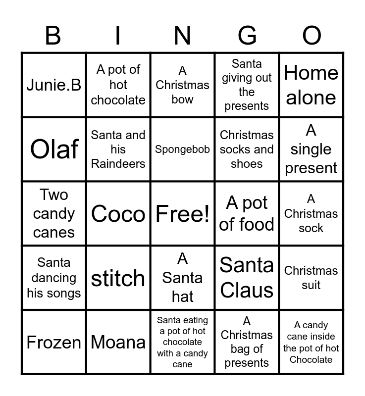 This bingo card has a free space and 24 words: stitch, Moana, Spongebob, Frozen, Home alone, Junie.B, Olaf, A pot of hot chocolate, A pot of food, A Santa hat, Christmas socks and shoes, Two candy canes, Santa Claus, Christmas suit, Santa and his Raindeers, A Christmas bag of presents, A Christmas sock, A Christmas bow, A single present, Coco, A candy cane inside the pot of hot Chocolate, Santa dancing his songs, Santa giving out the presents and Santa eating a pot of hot chocolate with a candy cane.