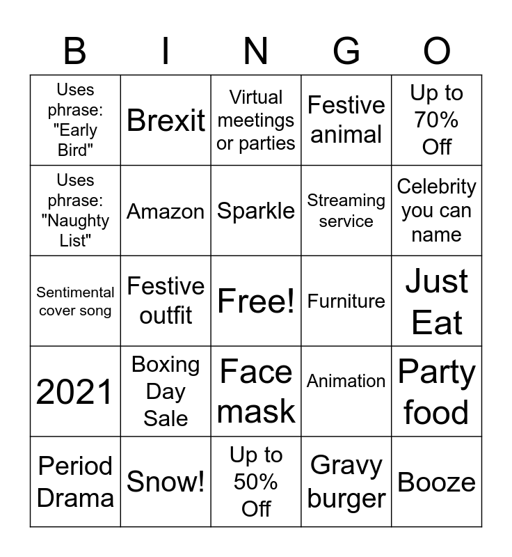 This bingo card has a free space and 24 words: Boxing Day Sale, Snow!, Sparkle, Period Drama, Up to 70% Off, Uses phrase: "Early Bird", Uses phrase: "Naughty List", Brexit, Furniture, Face mask, Streaming service, Sentimental cover song, Animation, Party food, Amazon, Gravy burger, Just Eat, Virtual meetings or parties, Celebrity you can name, Festive outfit, Booze, 2021, Festive animal and Up to 50% Off.