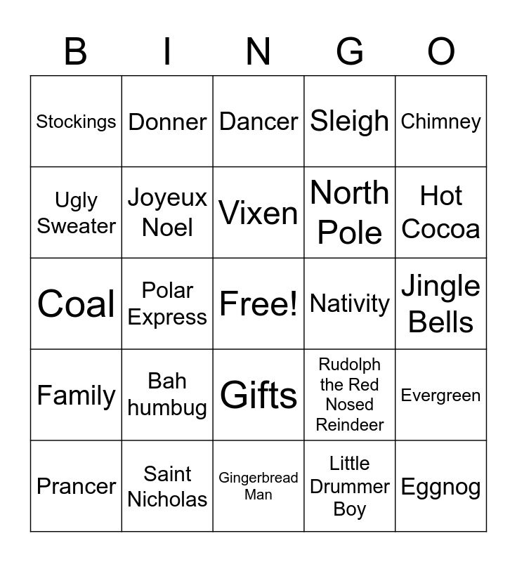 This bingo card has a free space and 54 words: Balsam, Family, Dasher, Fa La La La La, Gifts, Holly Jolly, Sleigh, Reindeer, Ugly Sweater, Tinsel, Stockings, Elves, Saint Nicholas, Prancer, The Grinch, Gingerbread Man, Eggnog, North Pole, Blitzen, Jingle Bells, Rudolph the Red Nosed Reindeer, Christmas Cards, Nativity, Chimney, Angels, Donner, Nutcracker, Naughty, Frosty the Snowman, Little Drummer Boy, Wreath, Candy cane, Poinsetta, Mistletoe, Dancer, Fruitcake, Coal, Evergreen, Santa, Joyeux Noel, Sugar Cookies, Kris Kringle, Jesus Christ is born, Wrapping Paper, Bah humbug, Seasons Greetings, December 25, Bethlehem, Vixen, Polar Express, Hot Cocoa, Jack Frost, Yuletide and Comet Cupid.