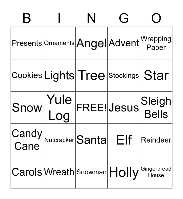 This bingo card has a free space and 24 words: Nutcracker, Wreath, Tree, Carols, Wrapping Paper, Presents, Cookies, Ornaments, Jesus, Santa, Stockings, Snow, Elf, Reindeer, Lights, Holly, Sleigh Bells, Angel, Star, Yule Log, Gingerbread House, Candy Cane, Advent and Snowman.