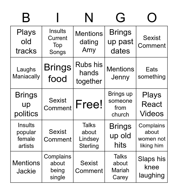 This bingo card has a free space and 24 words: Sexist Comment, Complains about being single, Rubs his hands together, Mentions Jackie, Sexist Comment, Plays old tracks, Laughs Maniacally, Insults Current Top Songs, Brings up someone from church, Talks about Lindsey Sterling, Mentions Jenny, Brings up politics, Brings up old hits, Complains about women not liking him, Brings food, Talks about Mariah Carey, Plays React Videos, Mentions dating Amy, Eats something, Sexist Comment, Slaps his knee laughing, Insults popular female artists, Brings up past dates and Sexist Comment.
