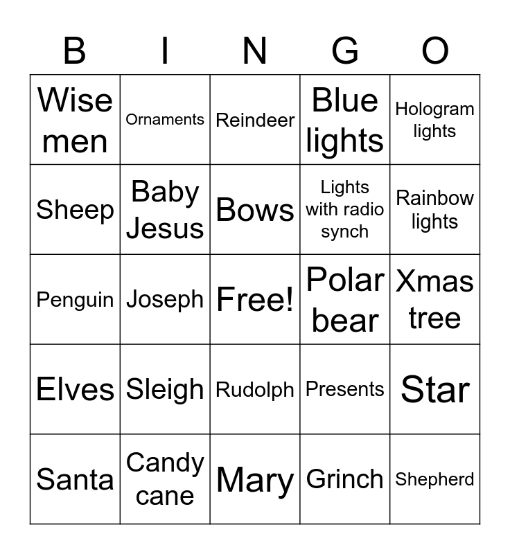 This bingo card has a free space and 24 words: Santa, Sleigh, Bows, Grinch, Hologram lights, Wise men, Ornaments, Reindeer, Polar bear, Xmas tree, Penguin, Baby Jesus, Presents, Star, Sheep, Candy cane, Mary, Blue lights, Rainbow lights, Elves, Joseph, Rudolph, Lights with radio synch and Shepherd.