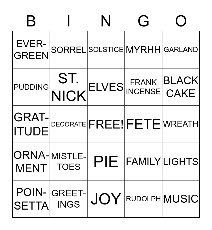 This bingo card has a free space and 24 words: MISTLE- TOES, GREET- INGS, ELVES, POIN- SETTA, GARLAND, EVER- GREEN, PUDDING, SORREL, FETE, PIE, FRANK INCENSE, GRAT- ITUDE, FAMILY, LIGHTS, ST. NICK, RUDOLPH, WREATH, SOLSTICE, BLACK CAKE, DECORATE, MUSIC, ORNA-MENT, MYRHH and JOY.