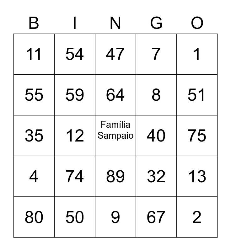 This bingo card has a free space and 24 words: 74, 50, 64, 80, 1, 11, 55, 54, 40, 89, 8, 35, 32, 13, 59, 67, 75, 47, 51, 12, 2, 4, 7 and 9.