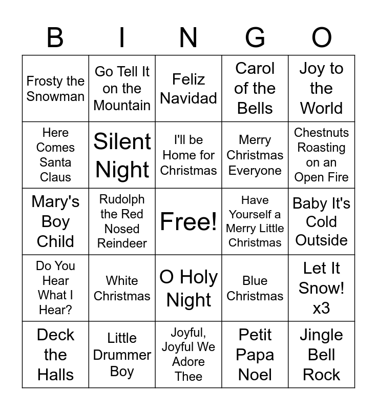 This bingo card has a free space and 68 words: All I Want for Christmas is You, Jingle Bell Rock, It's Beginning to Look A Lot like Christmas, Sleigh Ride, Last Christmas, Rockin Around the Christmas Tree, Go Tell It on the Mountain, O Come All Ye Faithful, I'll be Home for Christmas, What Child Is This, O Holy Night, God Rest Ye Merry Gentlemen, Baby It's Cold Outside, Joy to the World, Holly Jolly Christmas, Here Comes Santa Claus, Rudolph the Red Nosed Reindeer, Frosty the Snowman, Happy Xmas (War is Over), White Christmas, Merry Christmas Everyone, Blue Christmas, Do You Hear What I Hear?, Winter Wonderland, I Saw Mommy Kissing Santa Claus, One More Sleep, Santa Baby, Like It's Christmas, Let It Snow! x3, Mistletoe, Feliz Navidad, Santa Tell Me, Do They Know It's Christmas?, Mary Did You Know?, Carol of the Bells, That's Christmas to Me, White Winter Hymnal, Deck the Halls, Chestnuts Roasting on an Open Fire, Mary's Boy Child, Oh Christmas Tree, Zion's Daughter, Silent Night, O Little Town of Bethlehem, Hark the Herald Angels Sing, O Come Divine Messiah, Jingle Bells, 12 Days of Christmas, Have Yourself a Merry Little Christmas, Little Drummer Boy, Angels We Have Heard on High, O Come, O Come Emmanuel, Away in a Manger, Joyful, Joyful We Adore Thee, The First Noel, Wonderful Christmastime, Petit Papa Noel, Auld Lang Syne, Someday at Christmas, Jolly Old Saint Nicholas, It's the Most Wonderful Time of the Year, Lonely This Christmas, Run Rudolph Run, Snata Claus is Coming to Town, We Three Kings, I Saw Three Ships, Driving Home for Christmas and We Wish You a Merry Christmas.