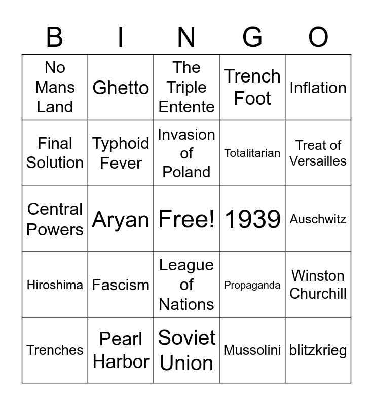 This bingo card has a free space and 24 words: Fascism, Pearl Harbor, Invasion of Poland, Trenches, Inflation, No Mans Land, Final Solution, Ghetto, 1939, League of Nations, Totalitarian, Central Powers, Propaganda, Winston Churchill, Typhoid Fever, Mussolini, Auschwitz, The Triple Entente, Treat of Versailles, Aryan, blitzkrieg, Hiroshima, Trench Foot and Soviet Union.