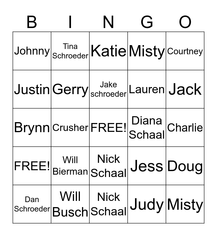 This bingo card has a free space and 24 words: Will Bierman, Will Busch, Jake schroeder, Dan Schroeder, Courtney, Johnny, Justin, Tina Schroeder, Diana Schaal, Nick Schaal, Lauren, Brynn, Jess, Doug, Gerry, Judy, Charlie, Katie, Jack, Crusher, Misty, FREE!, Misty and Nick Schaal.