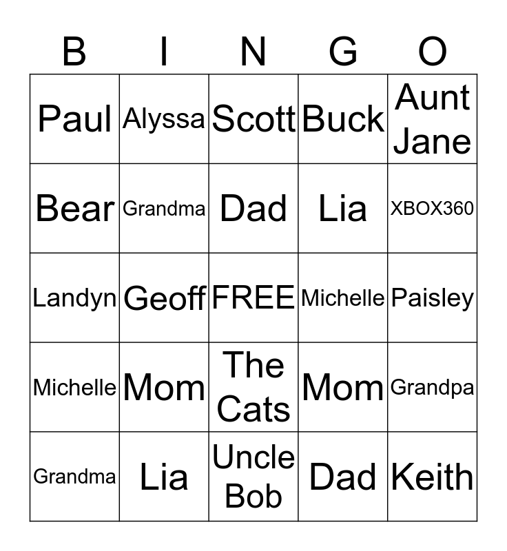 This bingo card has a free space and 24 words: Mom, Lia, Dad, Grandma, Aunt Jane, Paul, Bear, Alyssa, Michelle, The Cats, Lia, Landyn, Mom, Grandpa, Grandma, Dad, Paisley, Scott, XBOX360, Geoff, Keith, Michelle, Buck and Uncle Bob.