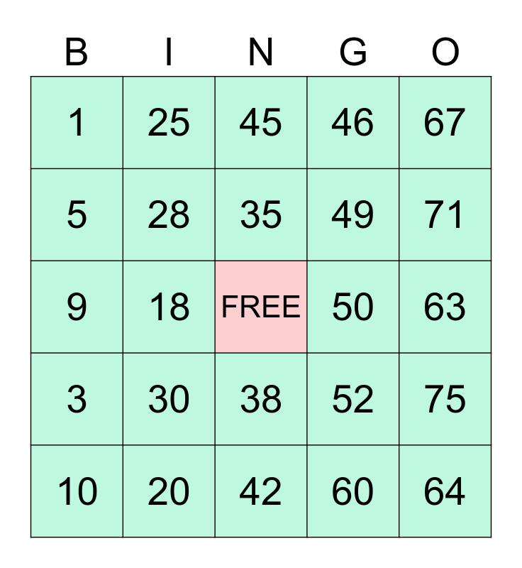 This bingo card has a free space and 24 words: 10, 30, 35, 60, 67, 1, 25, 45, 50, 63, 9, 28, 52, 75, 5, 20, 42, 46, 71, 3, 18, 38, 49 and 64.