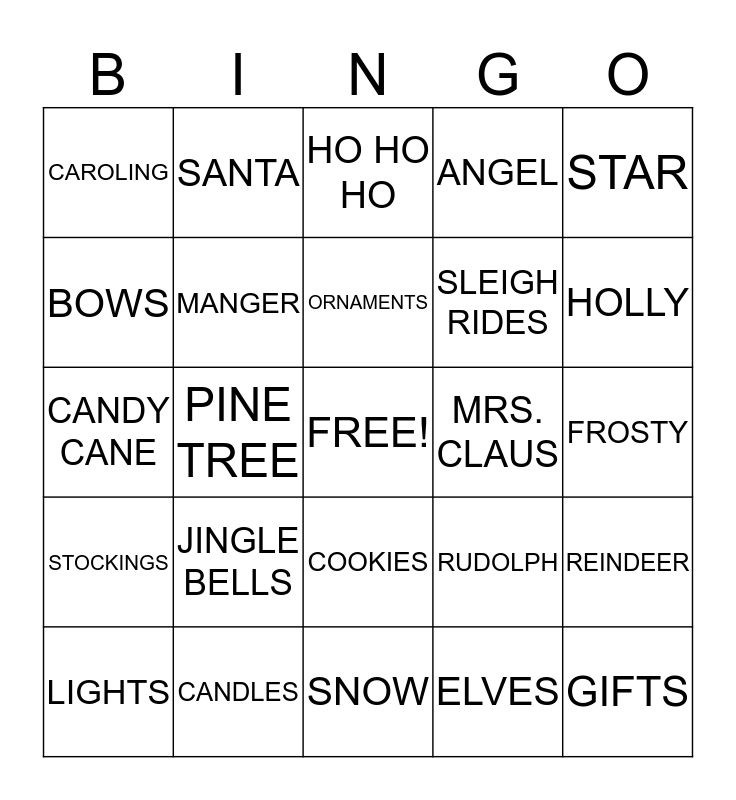 This bingo card has a free space and 24 words: JINGLE BELLS, CANDLES, ORNAMENTS, LIGHTS, STAR, CAROLING, BOWS, SANTA, MRS. CLAUS, COOKIES, SLEIGH RIDES, CANDY CANE, RUDOLPH, REINDEER, MANGER, ELVES, FROSTY, HO HO HO, HOLLY, PINE TREE, GIFTS, STOCKINGS, ANGEL and SNOW.