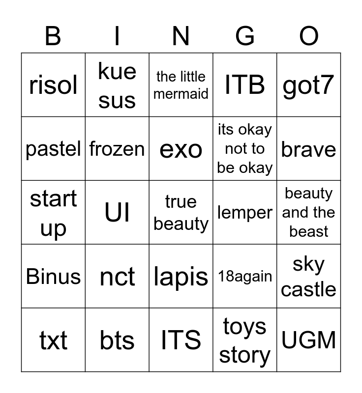 This bingo card has a free space and 24 words: nct, bts, exo, txt, got7, risol, pastel, kue sus, lemper, lapis, its okay not to be okay, start up, 18again, sky castle, frozen, toys story, beauty and the beast, the little mermaid, brave, UI, UGM, Binus, ITB and ITS.