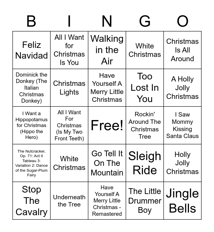 This bingo card has a free space and 38 words: It's the Most Wonderful Time of the Year, Mistletoe, It's Beginning to Look a Lot like Christmas, Christmas Lights, Holly Jolly Christmas, White Christmas, Have Yourself A Merry Little Christmas, Merry Christmas, Happy Holidays, Christmas Is All Around, Too Lost In You, All I Want For Christmas (Is My Two Front Teeth), White Christmas, Jingle Bells, I Saw Mommy Kissing Santa Claus, Dominick the Donkey (The Italian Christmas Donkey), The Nutcracker, Op. 71: Act II Tableau 3: Variation 2: Dance of the Sugar-Plum Fairy, Deck The Halls, Walking in the Air, Prologue, Rockin' Around The Christmas Tree, Feliz Navidad, Underneath the Tree, A Holly Jolly Christmas, Stop The Cavalry, Driving Home for Christmas, Have Yourself A Merry Little Christmas - Remastered, Rudolph The Red-Nosed Reindeer, Santa Baby, Ho Ho Ho, Flappie, The Twelve Days Of Christmas, Go Tell It On The Mountain, The Little Drummer Boy, All I Want for Christmas Is You, Wonderful Christmastime, Sleigh Ride, I Want a Hippopotamus for Christmas (Hippo the Hero) and Christmas Wrapping.
