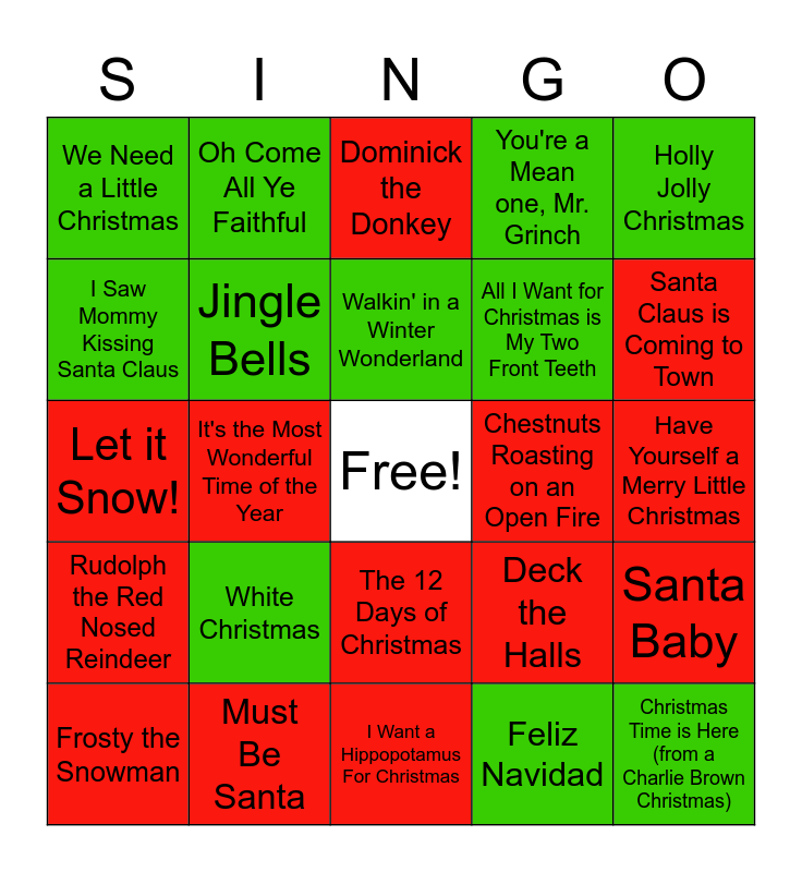 This bingo card has a free space and 39 words: Here Comes Santa Claus, Rockin' Around the Christmas Tree, Jingle Bell Rock, Jingle Bells, Frosty the Snowman, The 12 Days of Christmas, Walkin' in a Winter Wonderland, Silver Bells, Holly Jolly Christmas, Rudolph the Red Nosed Reindeer, It's the Most Wonderful Time of the Year, You're a Mean one, Mr. Grinch, Christmas Time is Here (from a Charlie Brown Christmas), Have Yourself a Merry Little Christmas, Chestnuts Roasting on an Open Fire, White Christmas, It's Beginning to Look a Lot Like Christmas, We Need a Little Christmas, We Wish You a Merry Christmas, Deck the Halls, I Saw Mommy Kissing Santa Claus, I Want a Hippopotamus For Christmas, All I Want for Christmas is My Two Front Teeth, Santa Claus is Coming to Town, Silent Night, Joy to the World, Hark the Herald Angels Sing, Blue Christmas, It Feels like Christmas (from Muppets), Oh Come All Ye Faithful, Mary Did You Know?, Mele Kalikimaka, Dominick the Donkey, Must Be Santa, Feliz Navidad, Carol of the Bells, Santa Baby, Let it Snow! and (There's No Place Like) Home for the Holidays.